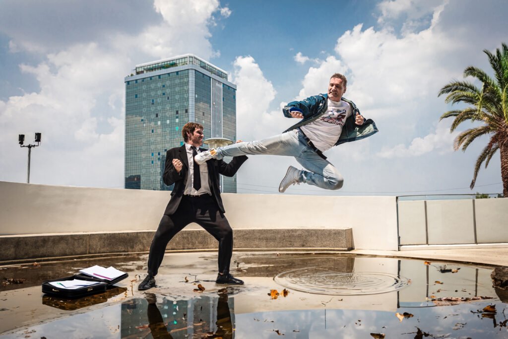 It took several attempts to capture the perfect frame. Timing was critical, and the midday heat made repeated high kicks physically demanding for Ron, especially while wearing denim clothing. However, after a few tries we successfully captured the moment where Ron’s kick reached its highest point, giving the image the look of a frozen cinematic frame.